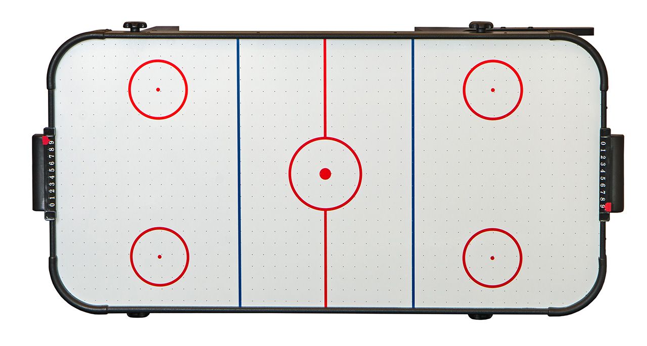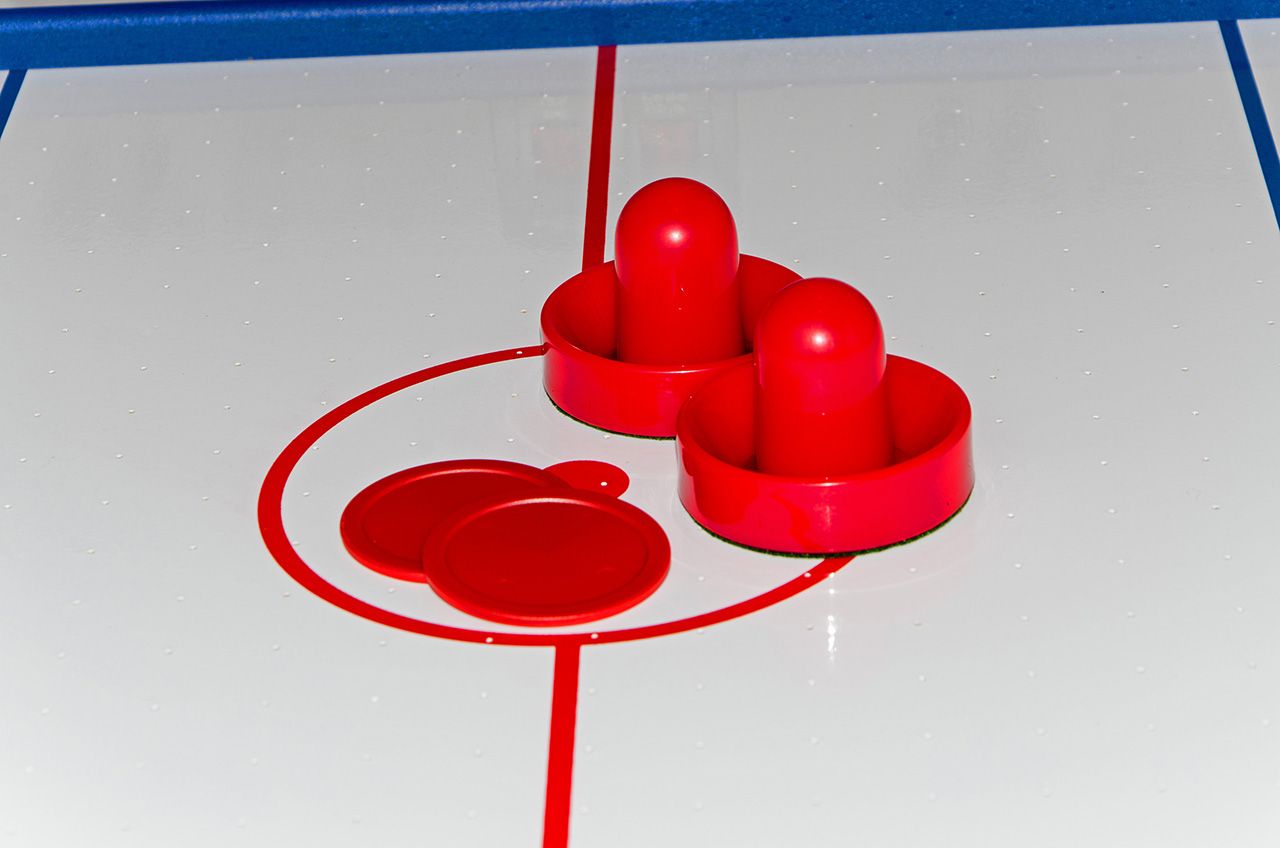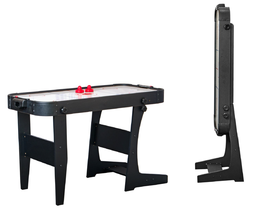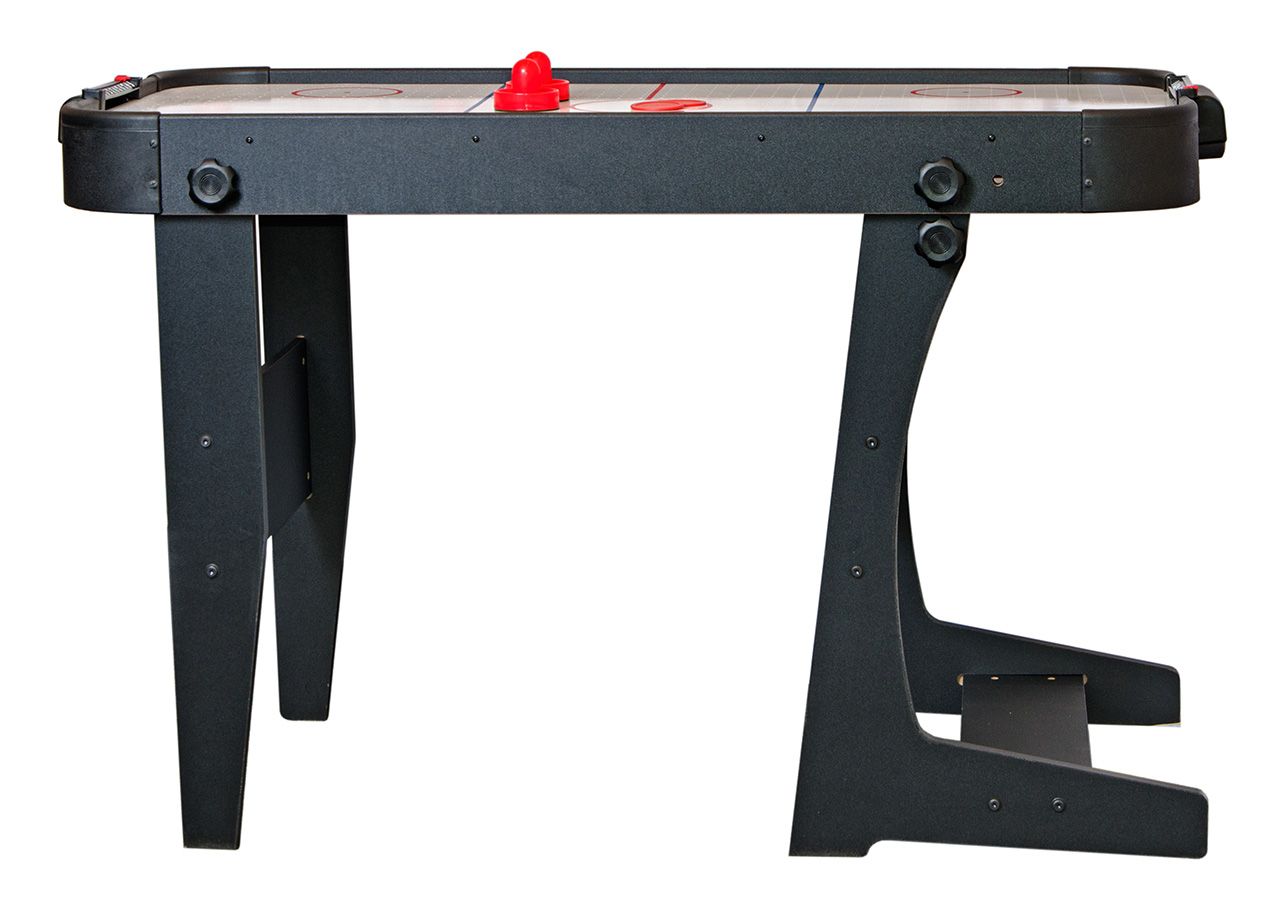 Компактный стол для аэрохоккея, выполненный из шлифованного МДФ и глянцевого ПВХ.