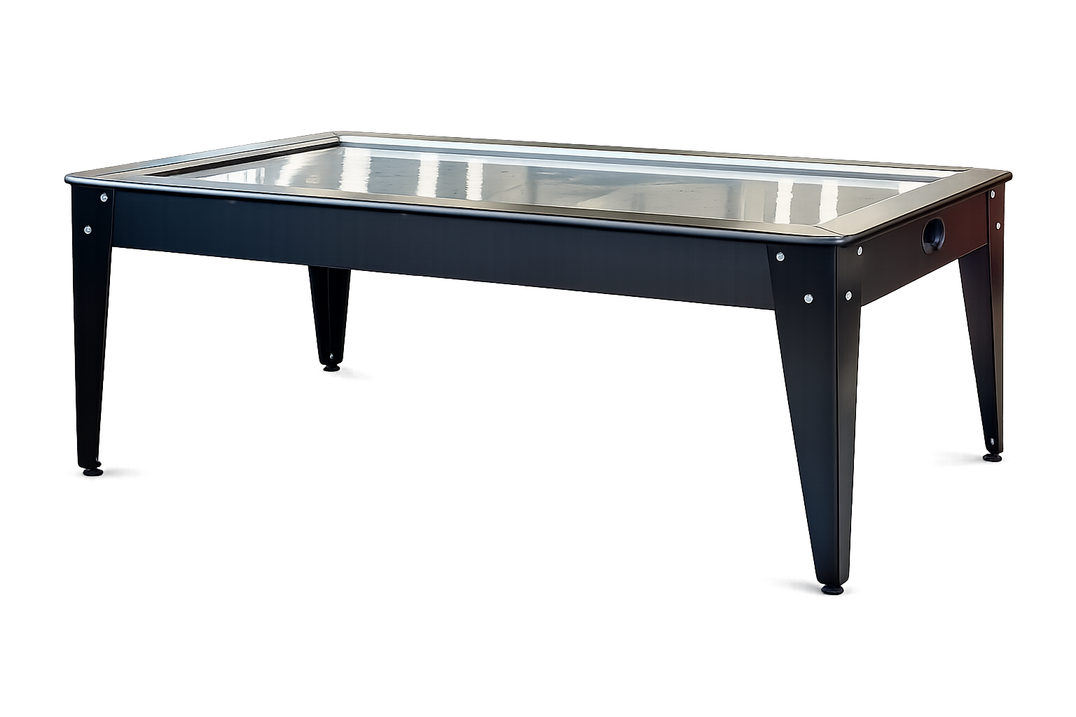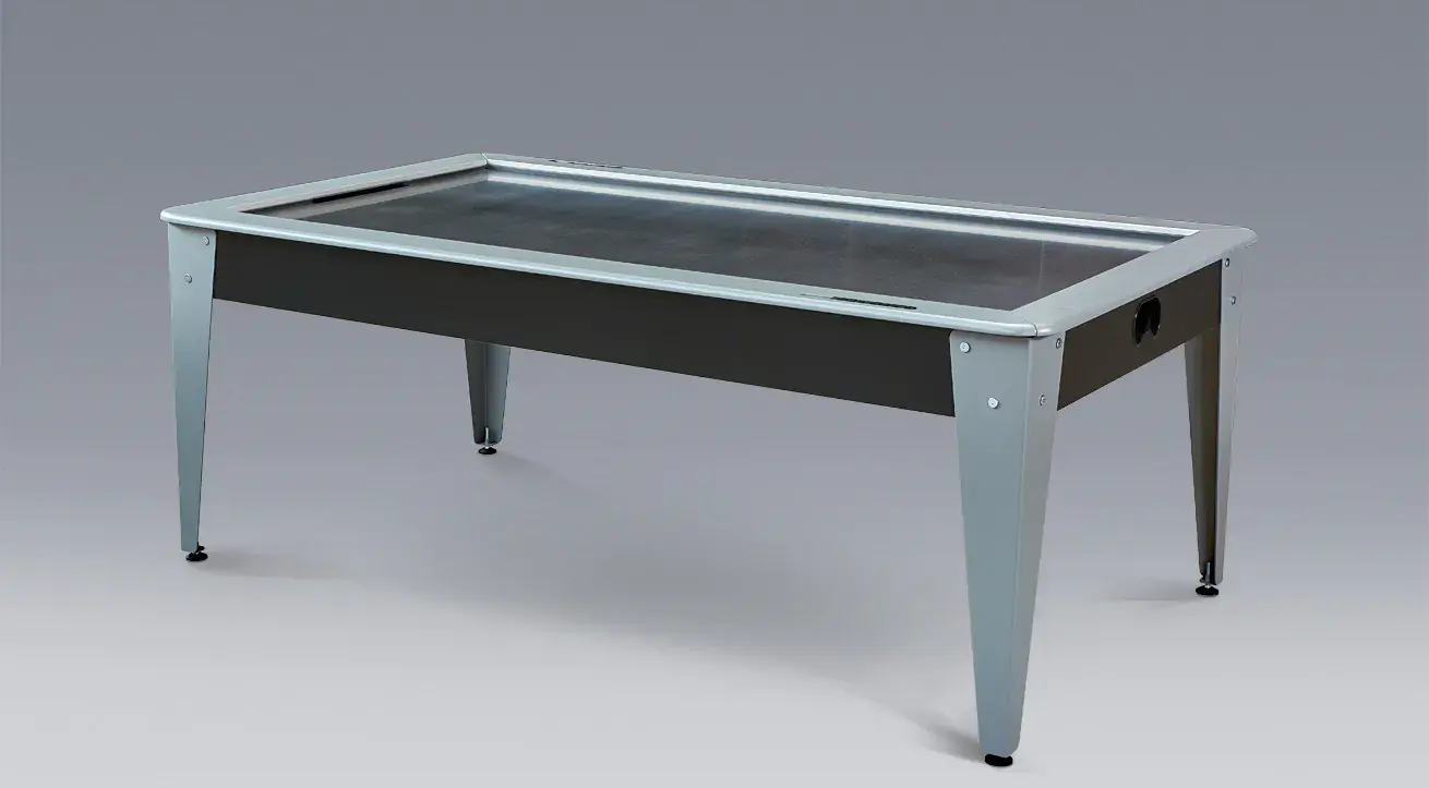 Компактный стол для аэрохоккея, выполненный из шлифованного МДФ и глянцевого ПВХ.